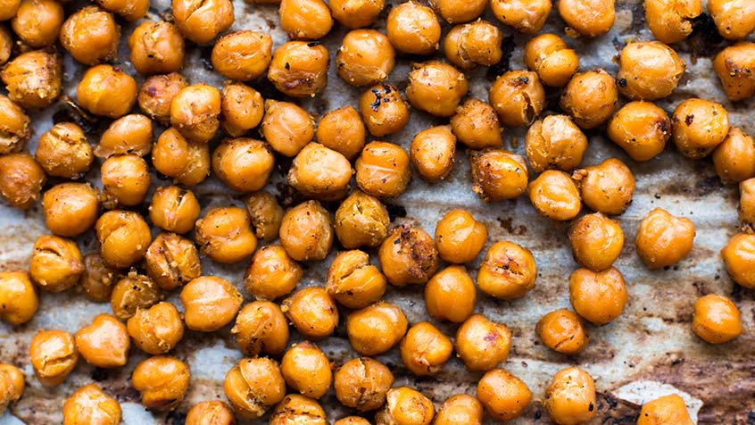 - Remove from the oven and toss with pinches of your favourite spices while the chickpeas are still warm.