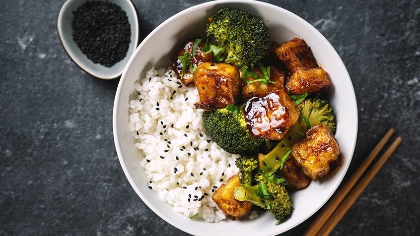 - Once everything is cooked, serve the rice in the bowl first. Then place your tofu, broccoli, and capsicum on top. Finally, lather the sauce on top.