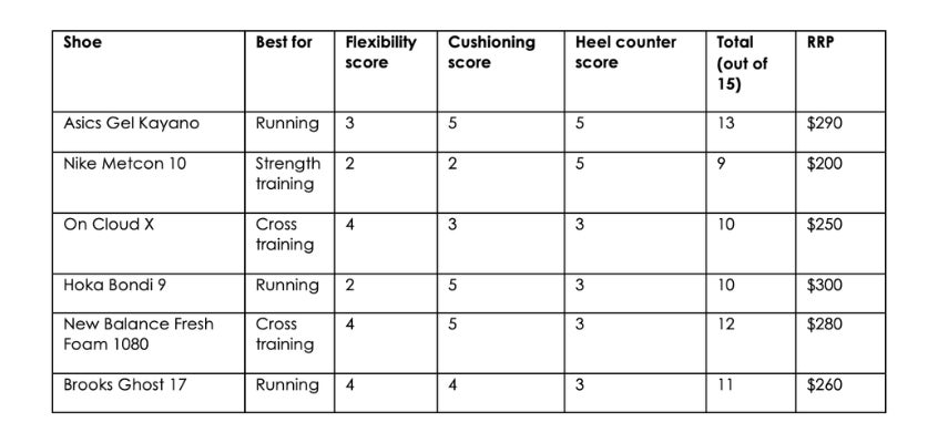Ok, enough already about heel counters, flexibility and cushioning! Now it’s time to compare popular shoe options and score them against the three factors discussed above.