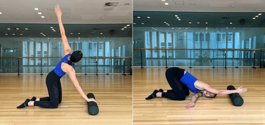 - To improve rotation, on all fours, take one arm out to the side, twist your upper back and arm to the ceiling (pushing the hand on the floor into the ground) and then dive your ear to the floor.